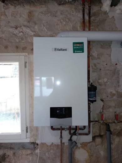 Installation d’une chaudière gaz à condensation de la marque Vaillant.